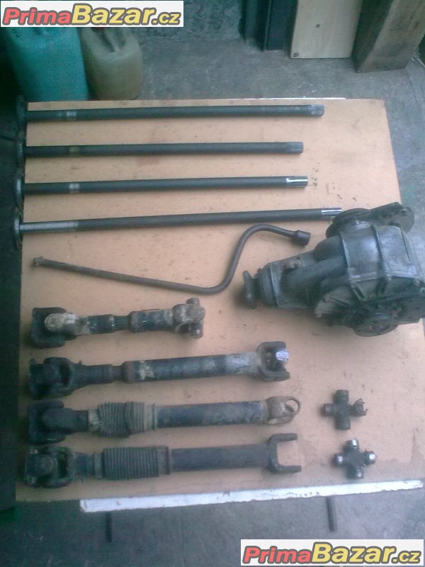 Zadní část karoserie včetně zadních dveří,zadní polosy,paliv. nádrž,zesílená listová pera,šípová pneu 7,5/16-1kus,přední diferenciál s kardany,nárazníky,volnoběžky ,zadní světla..