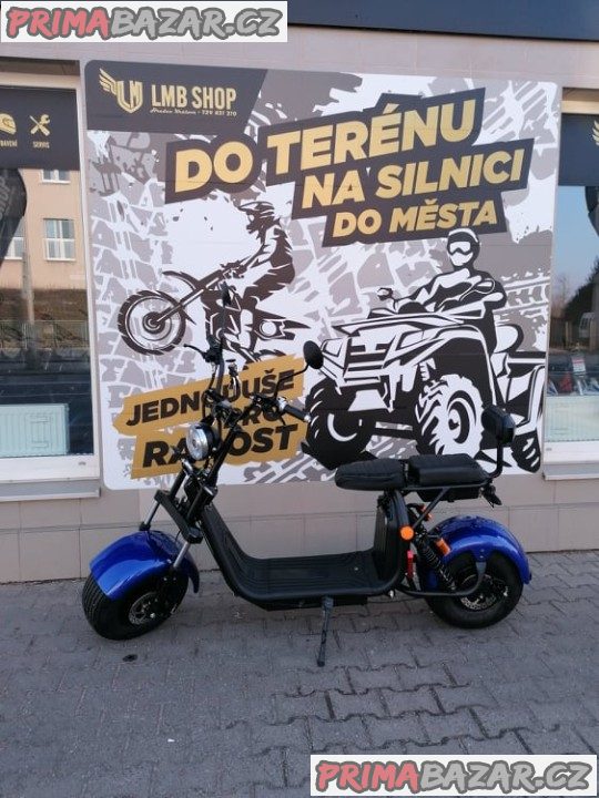 Možnost prodeje na splátky Možnost dopravy až k Vám domů po celé ČR. Stroj od nás dostanete zdarma smontovaný a odzkoušený stačí jen sednout a jezdit. V barvách: modrá, zelená, černá, červená Plně vybavená koloběžka: Bez klíčové startování jedním tlačítkem Alarm - vybaveno otřesovým čidlem Klakson LED světla a blinkry Úložný prostor pod sedlem Možnost dokoupení druhé baterie do podlahy Centrální dálkové zamykání koloběžky Zámek říditek Digitální barevný display Velká pohodlná elektrokoloběžka 1500W motorem a dojezdem až 80 km je tím pravým dopravním prostředkem, který Vás přepraví rychlostí až 45km/h na všech komunikacích. Baterii můžete dobít za 6h a to snadno i mimo koloběžku. Mezi hlavní přednosti této koloběžky patří velká kola, pohodlné sezení pro dvě osoby a široká výbava. Výkon 1500 W Hmotnost 63 kg Nosnost 200 kg Max. rychlost 45 km/h Max. dojezd 80 km Doba nabíjení 6 - 8 hodin Baterie 60V 20AH Typ baterie Lithium Pneumatiky 18x9.5-8 Brzdy Kotoučové, hydraulické Rozměry1900 x 390 x 1000 mm