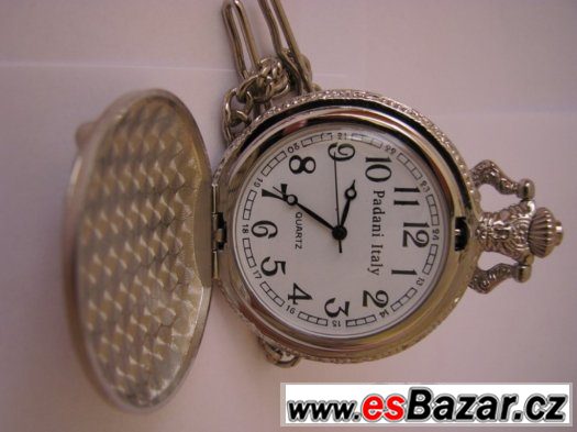 Zajímavé a krásné provedení . Velký přehledný ciferník 40mm. Řetízek ukončený přezkou pro zavěšení 350mm dlouhý. Zdobené zavírací pouzdro . Pevná celokovová konstrukce
