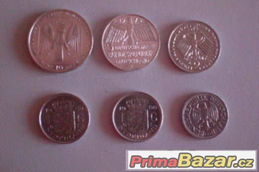 Prodám staré německé mince, kovové (stříbrné). Jednotlivé mince: 10 marek 1190 - 1990; 5 marek 1975; 2 marky 1949 - 1960 (1975); 1 marka 1954; "1G nederland" 1980 (2 ks)