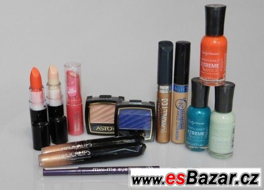 Mix kosmetiky, 3 x Sally Hansen lak na nehty, 1 x Korektor Astor Perfect Stay 24h, 1 x Rimmel London Scandaleyes dlouhotrvající oční stíny, 2 x oční stíny Astor, 2 x Apocalips lesk (lak) na rty, 1 x Miss Sporty automatická tužka na oči , 2 x Rimmel Dlouhotrvající pečující rtěnka, 1 x balzám na rty. Vše nové! DÁREK KOSMETICKÁ