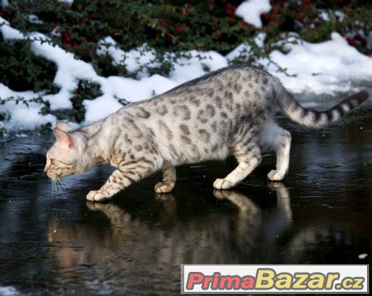 Devítiměsíční bengálku v exluzivní ledově stříbrné barvě, jako domácího mazlíčka momentálně nabízím se slevou. Kočička je mazlivá, čistotná, očkovaná, odčervená, čipovaná, plně socializovaná v kolektivu lidí, psů a ostatních koček. Neskáče na stůl a nedělá lumpárny. Oba rodiče jsou testováni na choroby: FIV, FeLV, PKD, PKdef a HCM. Se vším ráda poradím. Tel: 604 706 535, www.bengal – british-cats.cz