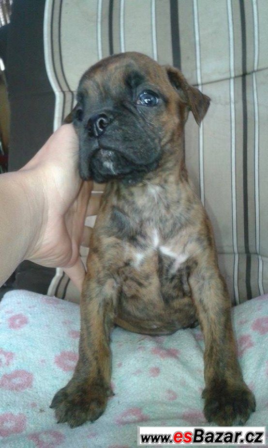 Německý boxer - na prodej štěňátka německého boxera s krátkým chvostom, po čistokrevných rodičích mohutné, dobře stavěné postavy. Odčervená, očkovaná, s veterinárním průkazom. Západ SR. 5.500 Kč.