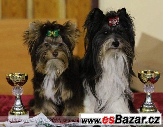 K odběru fenečka yorkshire terrier ,,Kiki Darling of Iron Mountains" s PP od německého klubu IBC s čoko a biewer genem po rodičích. Kiki je 13 týdnů, v dospělosti bude větší velikosti, má bohatou srst, je odchována v rodině s dětmi, je čipována a po druhém očkování, má vystavený pas pro cestování po EU. S sebou do nové rodiny si odveze základní výbavičku. Na poslední fotce jsou rodiče, oba výstavně úspěšní. Více informací a fotek naleznete na webových stránkách naší CHS www.darling.majestat.cz