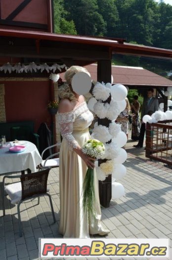 Luxusní šaty šité od švadleny na míru, barva šampaň, zlatavá, sukně a korzet je z mírně elastického saténu, vršek z pevné krajky drží tvar a je přichycen ke korzetu.Šaty jsou v jenom kuse na zádech na zip. Velikost mám L, měřím 172 a měla jsem boty s 10cm podpadkem, délka kolové sukně 112cm, šířka dolního okraje 2x 210cm, pas 40-42cm prsa 80B, může být i C krajkový rukáv délka 40cm, měla jsem na sobě asi 3hodiny.
