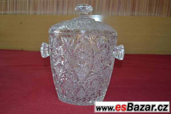 Křišťálový set na bowle - 1x mísa s víkem (výška 27cm, průměr 20cm), 10x hrnek s uchem (výška 7,5cm, průměr 7,5cm), 1x tác (průměr cca 38,5cm), bez naběračky. Ve velice dobrém stavu, nepoškozené.